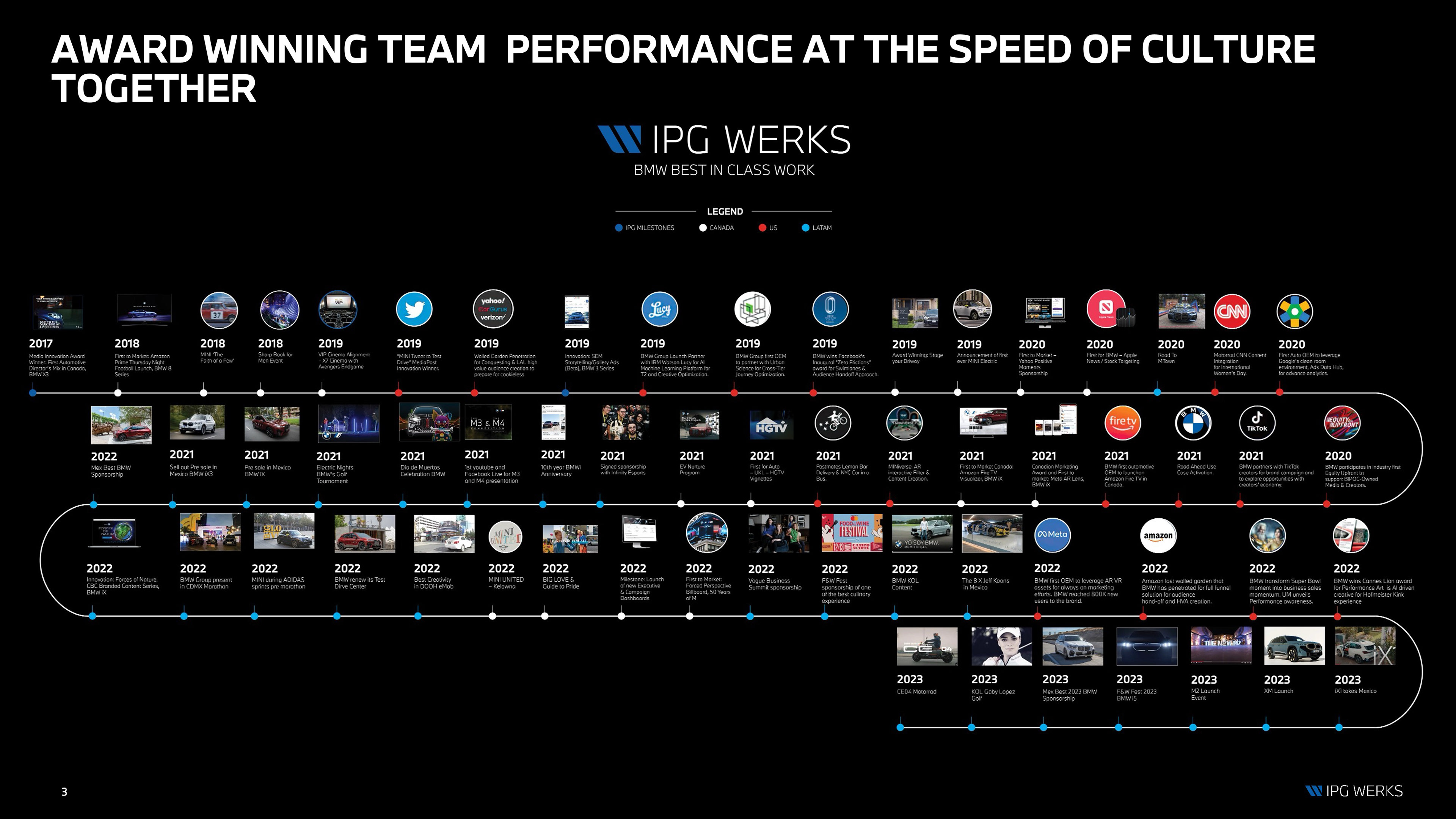 BMW Group needed a unified pitch-theater system spanning BMW, MINI, and Motorrad—one premium storytelling framework that could flex across strategy, data, EV platforms, and retail while feeling seamless across North America and LATAM. I led creative direction and design execution across both the deck and the physical pitch environment, ensuring every touchpoint—from narrative structure to in-room experience—reinforced a single, elevated BMW Group standard.