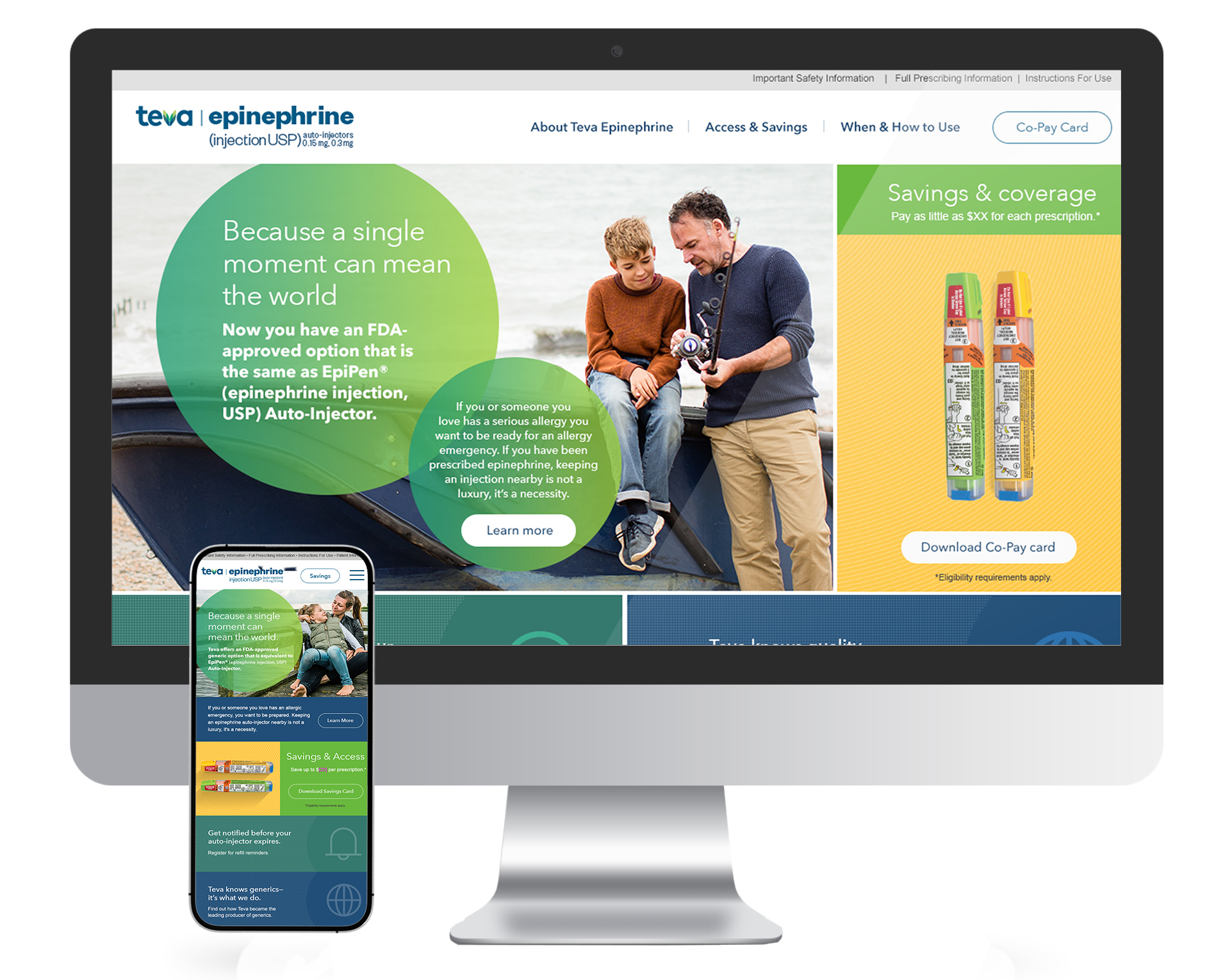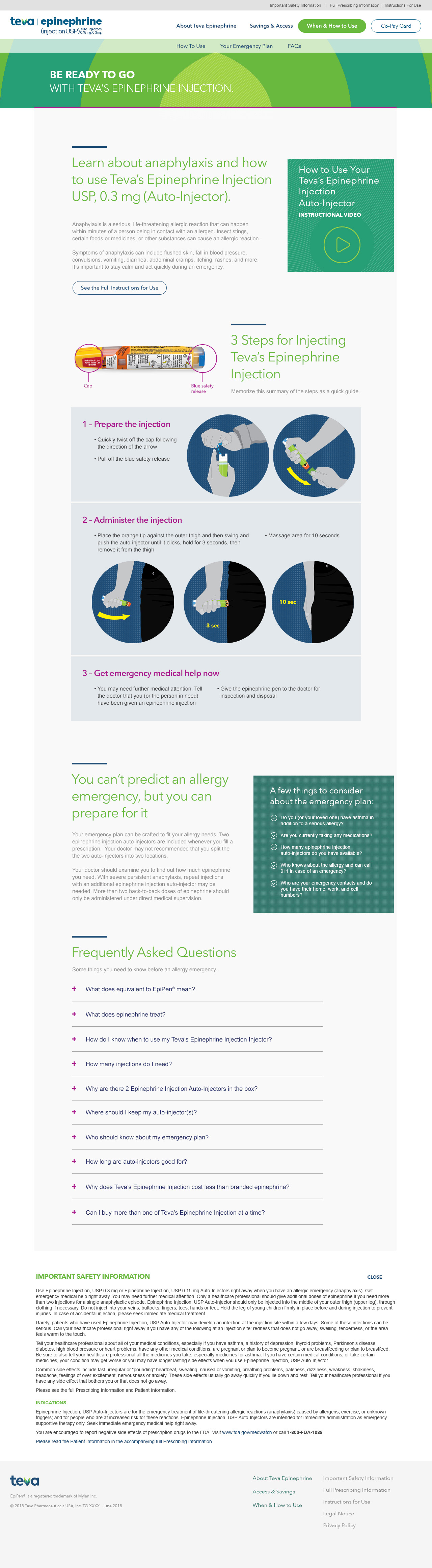 A clear, compliant microsite experience that helped HCPs and patients quickly understand when to use Teva’s epinephrine injection and how to take action (instructions, FAQs, access/savings).